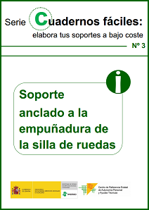 Tercer cuadernillo de la serie «Cuadernos fáciles: elabora tus soportes a bajo coste», en el que los profesionales del Área de Desarrollo Tecnológico del Ceapat explican cómo realizar un soporte para anclarlo a la empuñadura de la silla de ruedas. Como en otros cuadernillos de la serie, se describe todo el proceso paso a paso, con imágenes donde se muestran los materiales y la colocación de cada pieza.
